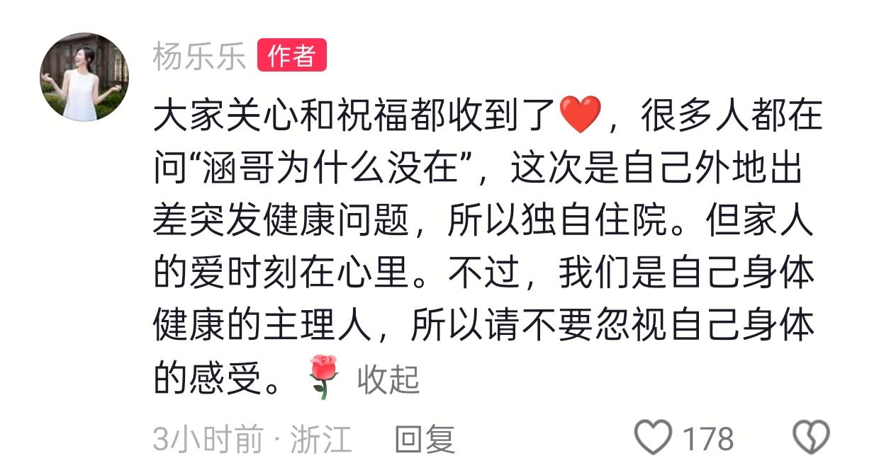 杨乐乐说汪涵之所以没在医院照顾她,是因为她这次生病住院是在外地出差突发的疾病,她没想到,汪涵也没想到,汪涵也赶不过来,毕竟汪涵平常的工作也挺忙的。