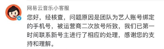 针对此事,网易云音乐官方客服账号发文表示,本次事件起因是艺人团队为艺人绑定的手机号被运营商二次放号,我们已经联系新号主进行相应处理。