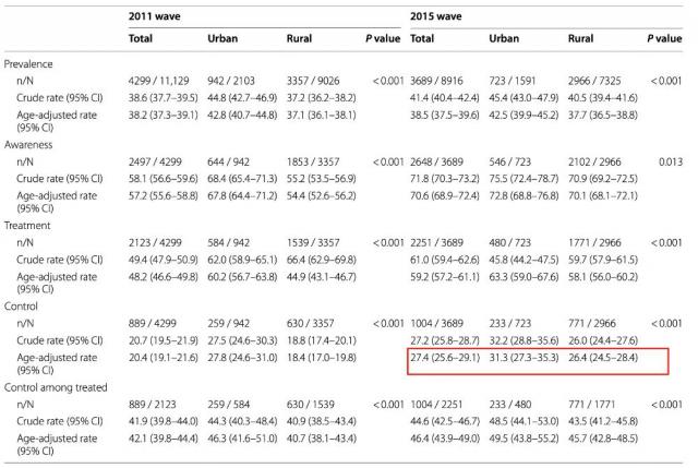 城乡之间的差距同样明显。虽然 2011 – 2015 年间,农村居民的高血压知晓率和治疗率有所提升,但控制率仍落后于城市:2015 年,城市高血压患者的控制率约为 31%,而农村约为 26% [ 3 ] 。