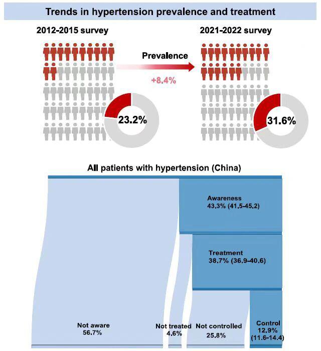 一项由中国医学科学院阜外医院王增武团队发表在《细胞》(Cell)子刊上的论文显示:中国成年人高血压患病率持续上升,2021-2022 年患病率为 31.6%,与 2012-2015 年相比,增加了 8.4%。