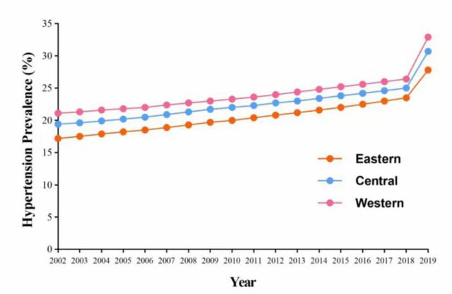 从地理分布来看,我国西部地区的高血压患病率最高,2019 年达到 32.9%,而东部和中部相对较低 [ 1 ] 。同时,北方整体水平高于南方,这与饮食习惯有直接关系——北方居民普遍偏好咸食,盐摄入量长期高于南方。